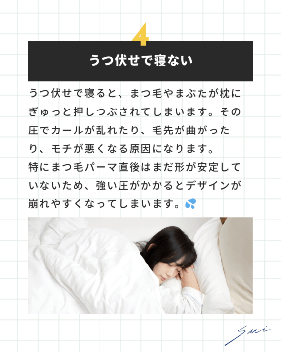 ✔︎ うつ伏せ寝は避けてまつ毛への圧をゼロに