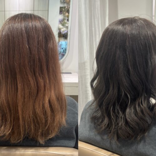 カラーはトーンを落ち着かせオレンジ味を抑え透明感のあるイメージに仕上げます